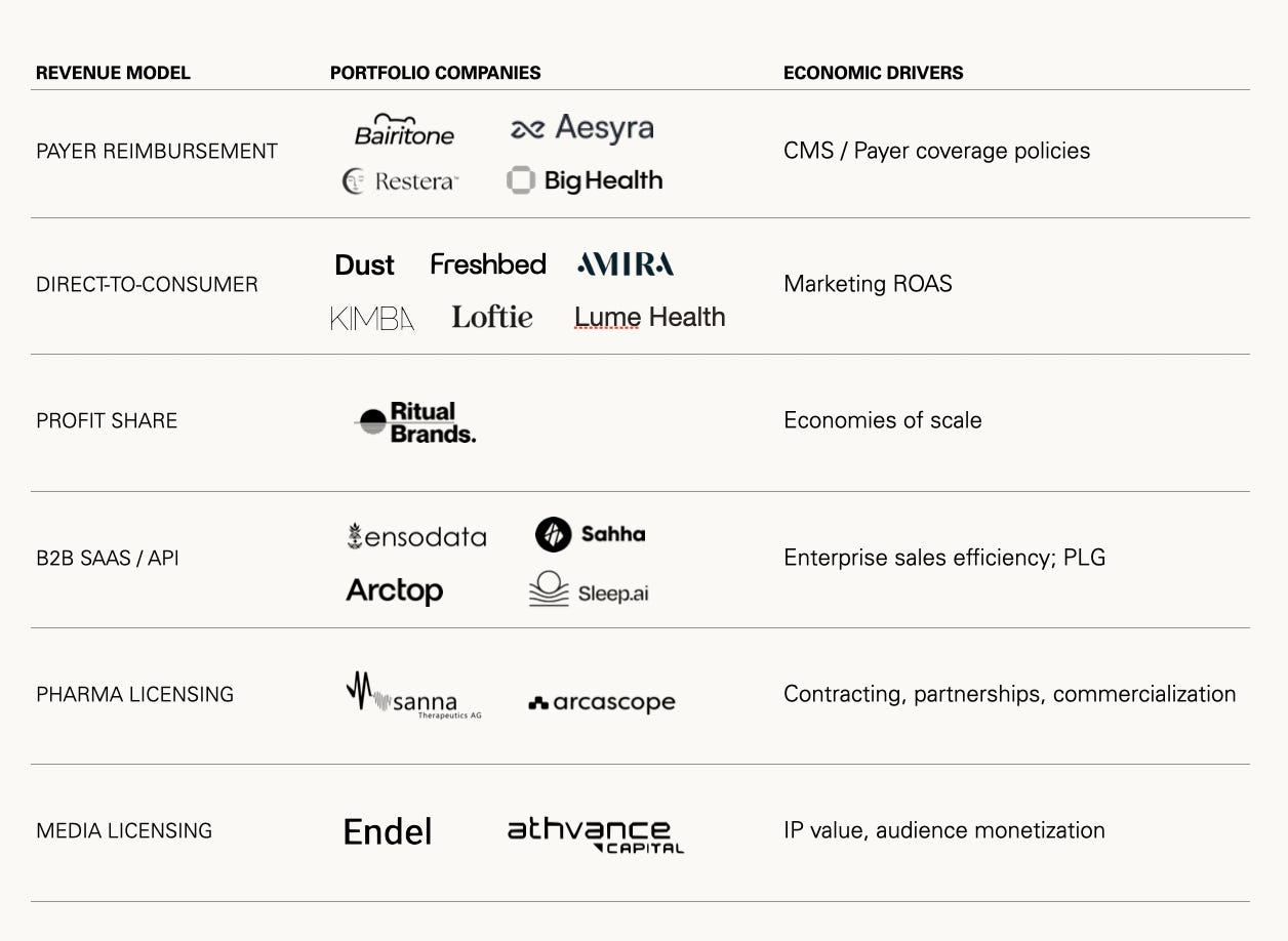 Our thematic focus on sleep is structurally different. While our portfolio companies share a theme — the science, technology, and sentiment of sleep — they do not share risk profiles.